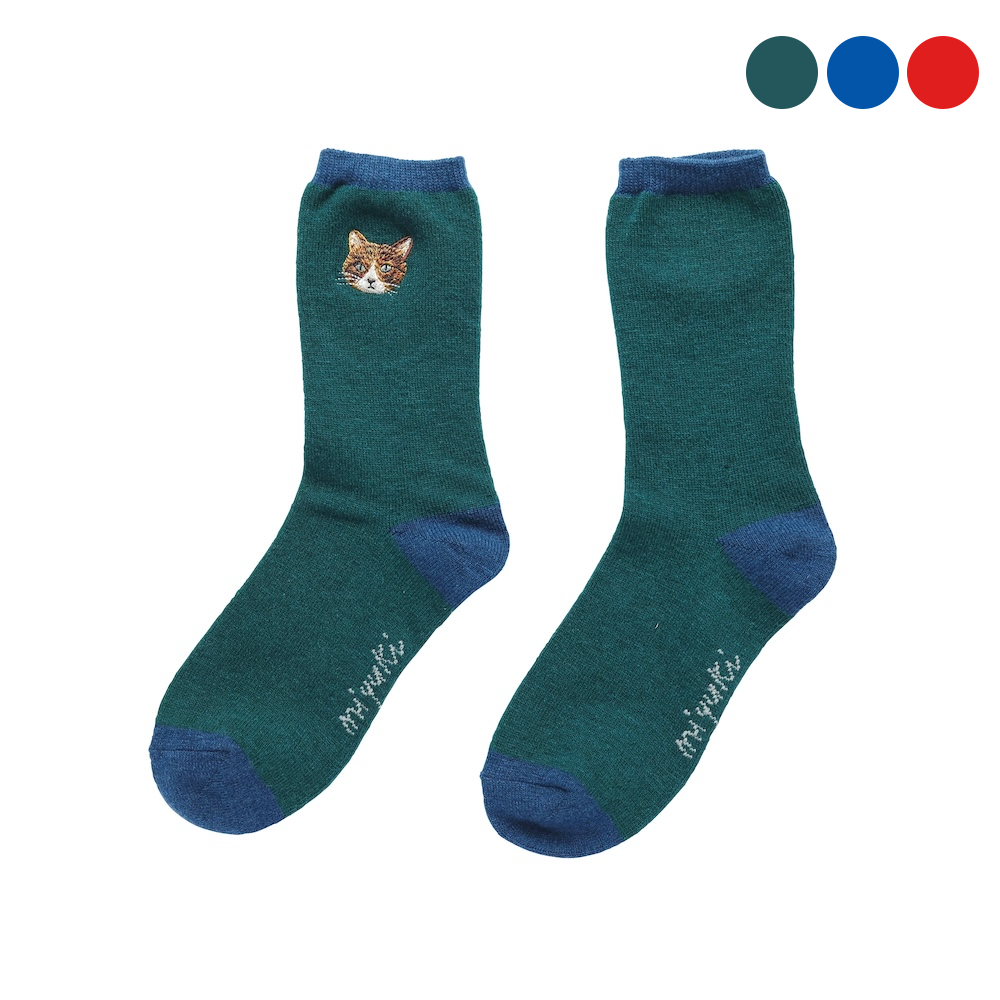 Matsuo Miyuki 刺繍のワンポイント 猫の靴下 Wool blend