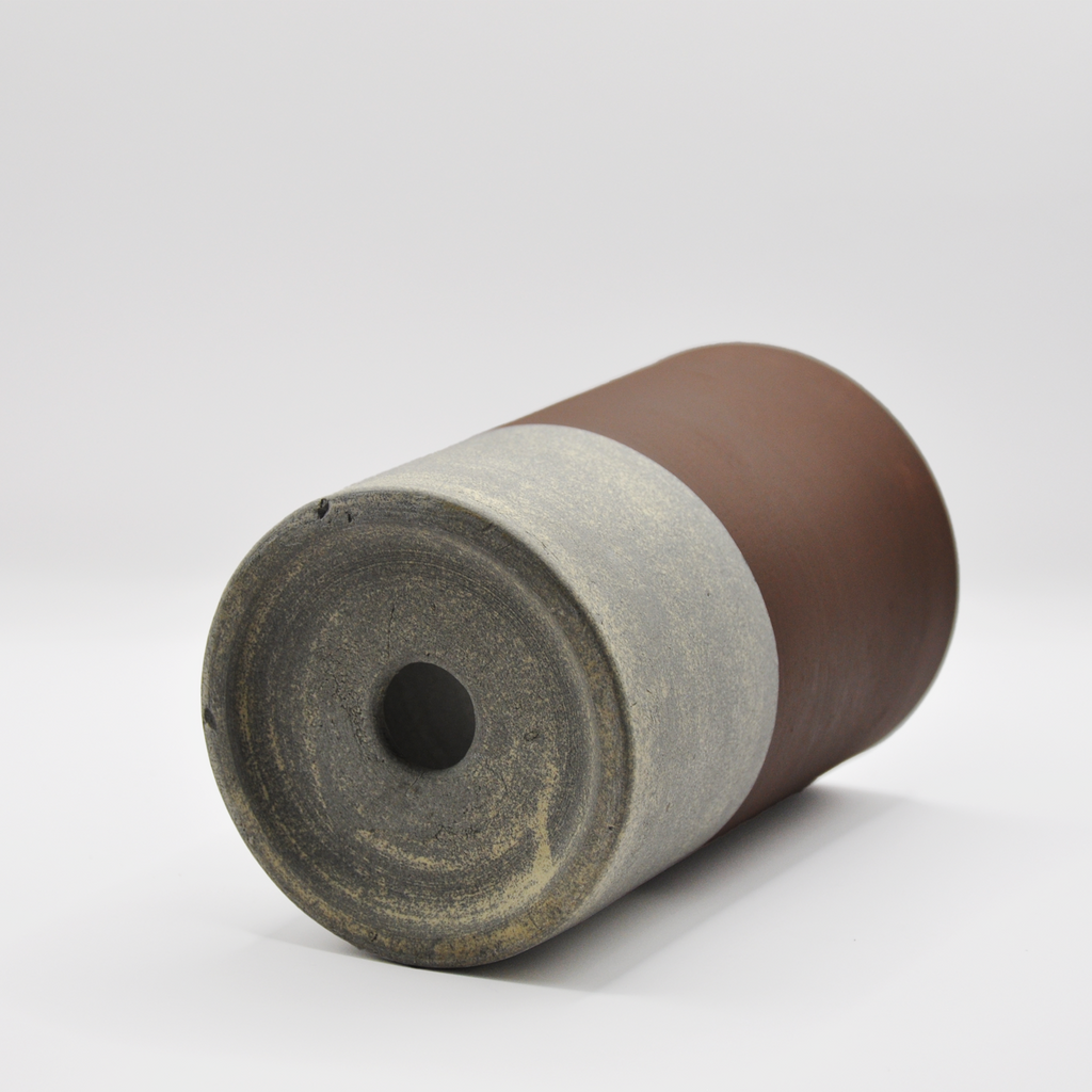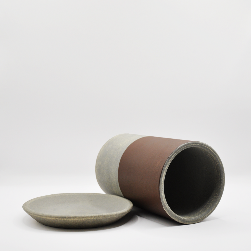 ツートンカラーが美しいシリンダーポット。シンプルなデザインで、どんな空間にも自然に馴染みます。高さがあるため、垂れ下がるタイプの観葉植物とも好相性。サボテンやハーブを植えて、お部屋をさりげなく彩るのにもぴったりです。底穴付きで、受け皿がセットになっているので水やりも便利。