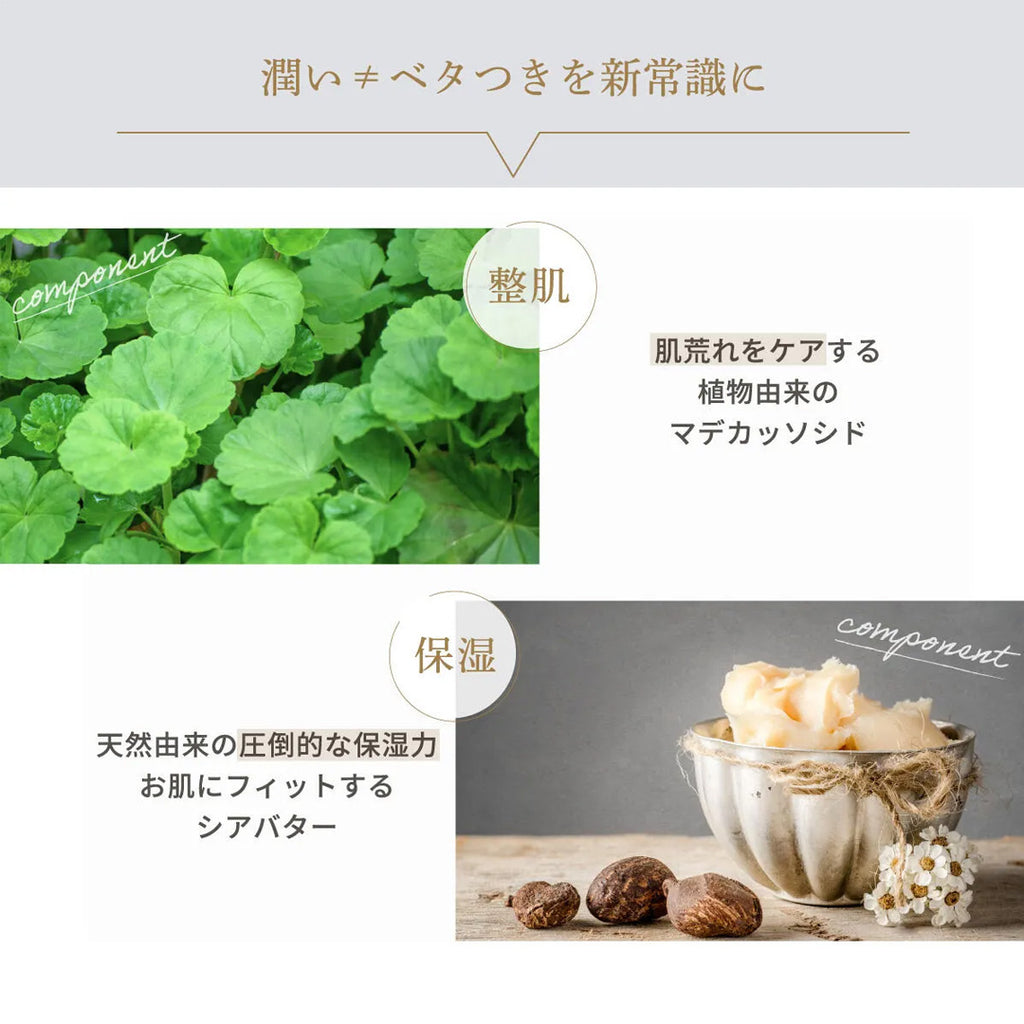 ツボクサ由来のマデカッソシドには、紫外線や刺激による肌荒れを防ぐ働きがあります。そんなツボクサエキスに由来するマデカッソシドを配合し、お肌のキメを整え、肌荒れのないカシミヤ肌へと導きます。使用感にもこだわり、さらっと伸びてべた付かないジェルクリームを採用しております。ベタつきの気になる夏場は乳液と置き換えて使用する事もできます。