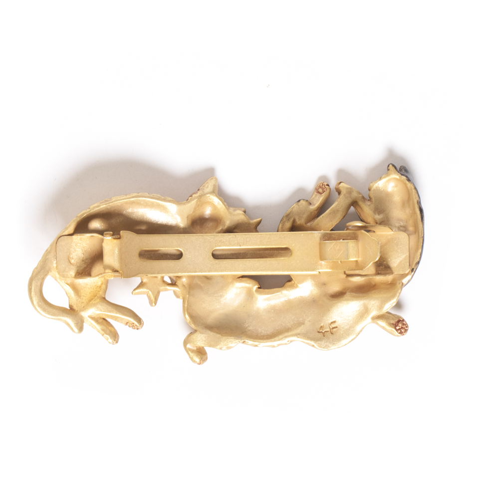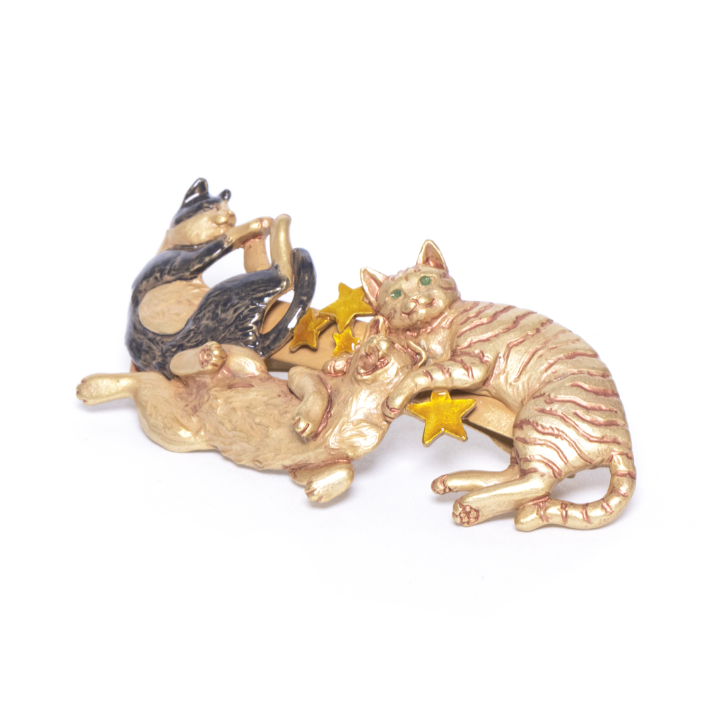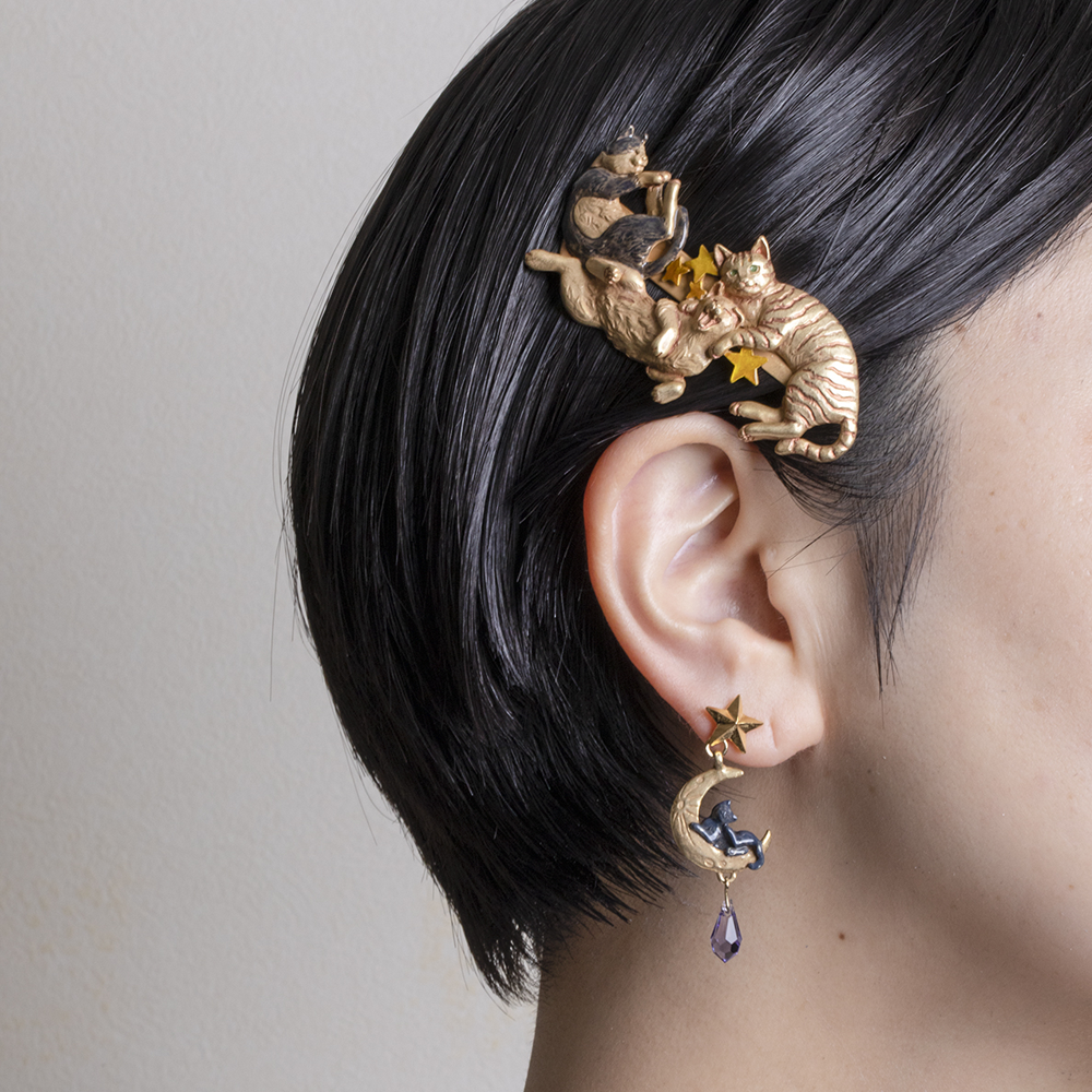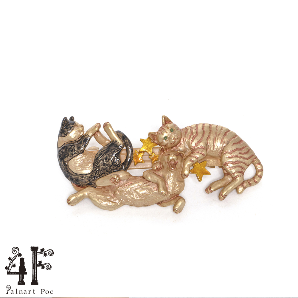 3匹の猫が寄り添って、まったりとくつろぐ姿が愛おしいバレッタ。星が静かにきらめく空間で、猫たちは幸せそうに夢の世界をお散歩中。